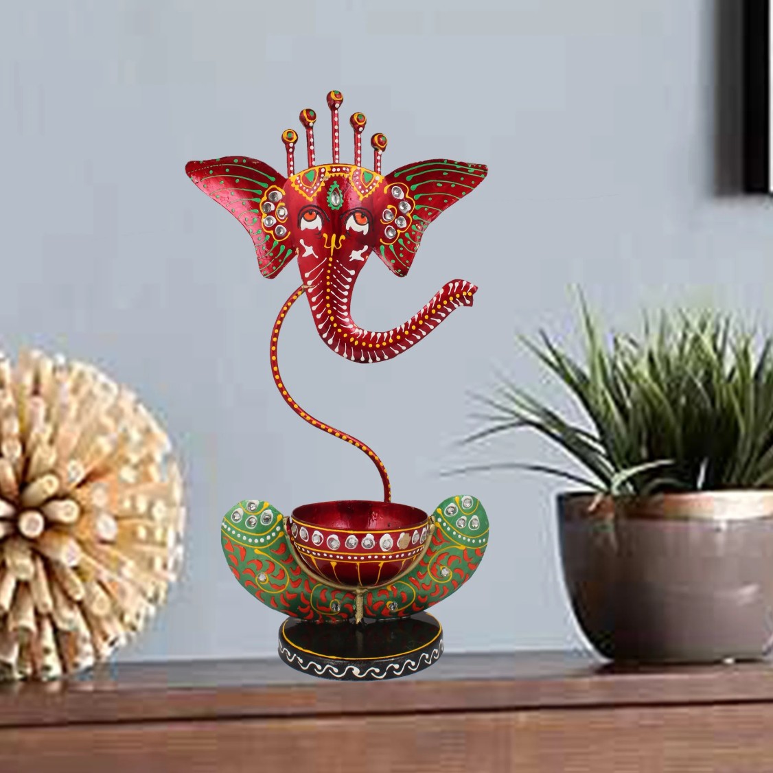 Ideal for Diwali décor, religious celebrations, housewarming occasions, or spiritual gifting, this red Ganesha tealight stand beautifully blends devotion with artistic elegance.