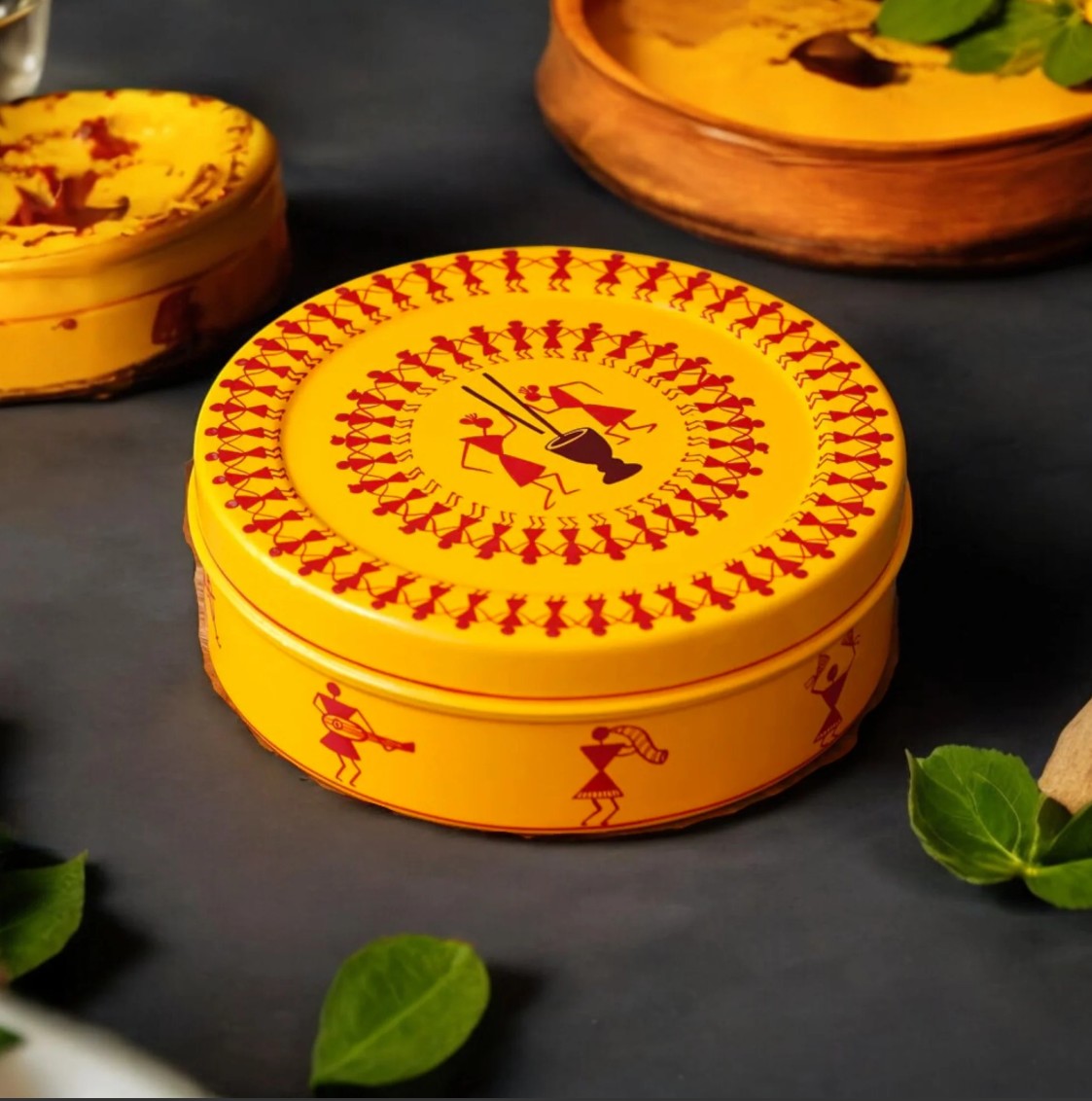 The snug-fitting lid helps preserve freshness and aroma, while the vibrant hand-painted folk art motifs in contrasting colors stand out against the cheerful yellow base. This spice box adds a lively, cultural touch to your kitchen décor and makes a thoughtful gift for cooking enthusiasts who appreciate handcrafted design.