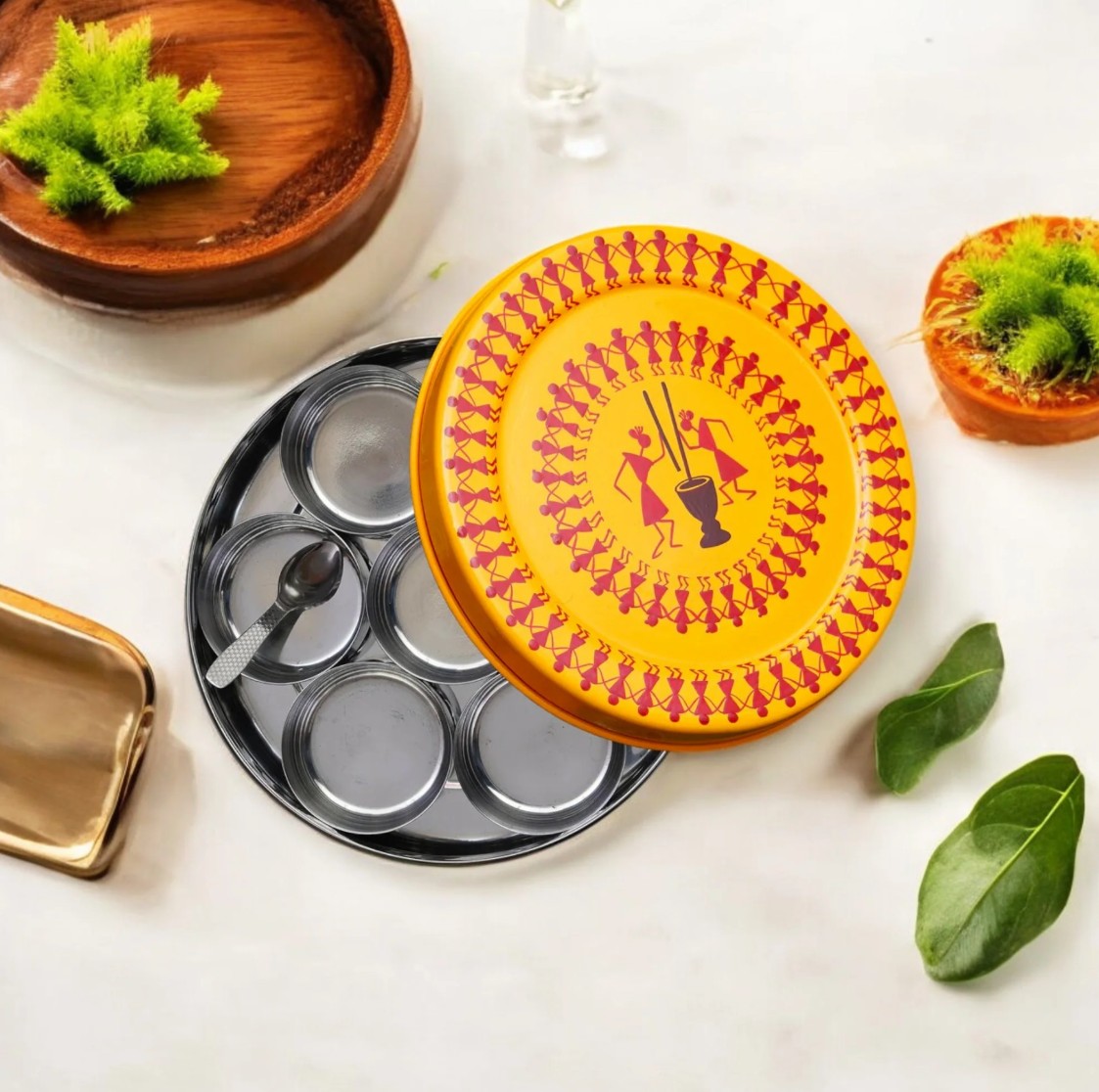 Keep your spices fresh and beautifully organized with this hand-painted stainless steel spice box, designed to blend everyday functionality with traditional Indian artistry. Crafted from durable stainless steel with a smooth finish, this round spice box features seven individual compartments, ideal for storing a variety of essential spices.