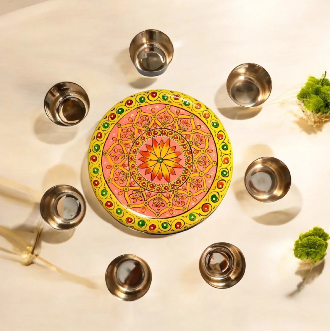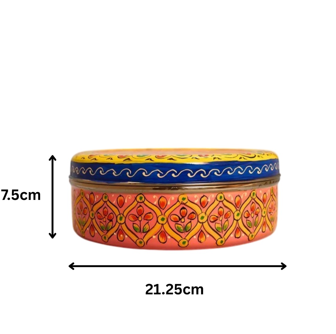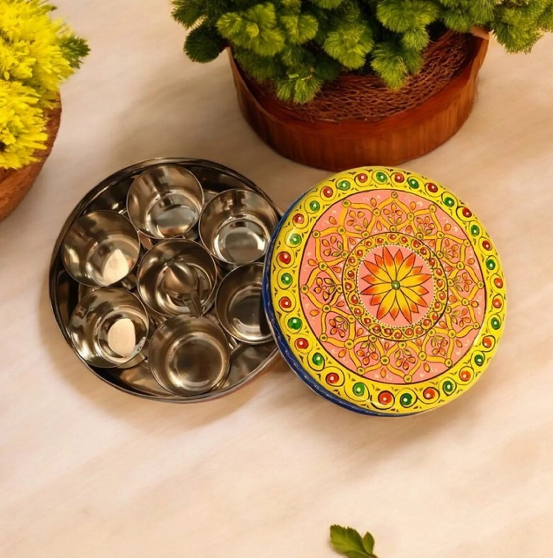 Keep your spices fresh and beautifully organized with this hand-painted steel spice box, designed to add both convenience and artistic charm to your kitchen. Crafted from durable steel with a smooth finish, this round spice box includes seven individual compartments, making it ideal for storing a variety of everyday spices.