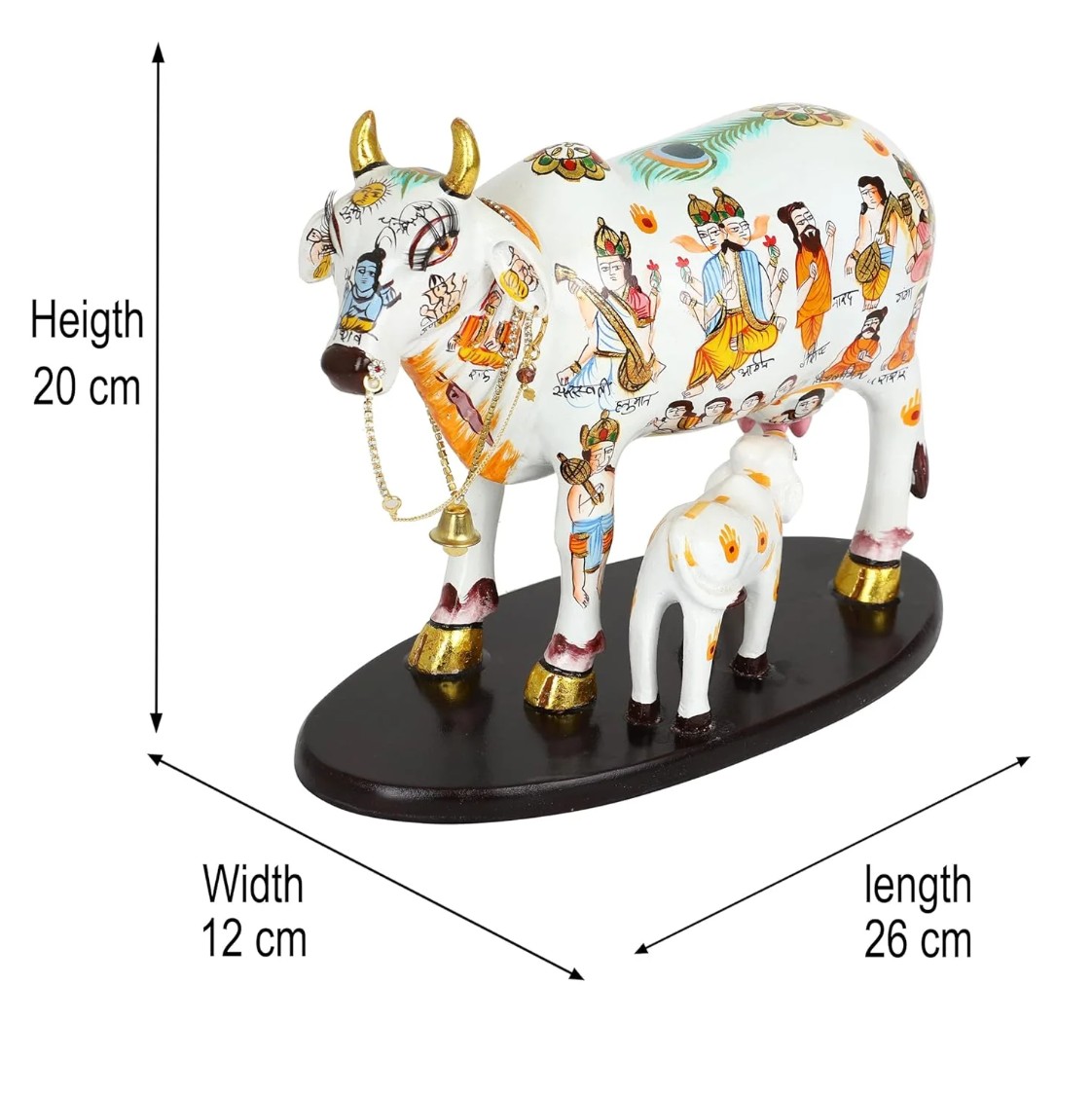 Beautifully hand-painted with vibrant colours, the statue features intricate detailing and depictions of Hindu deities adorning the cow’s body, reflecting the rich cultural heritage and artistic traditions of India. Crafted with care using high-quality, durable material, this decorative idol is designed to last while retaining its stunning finish.