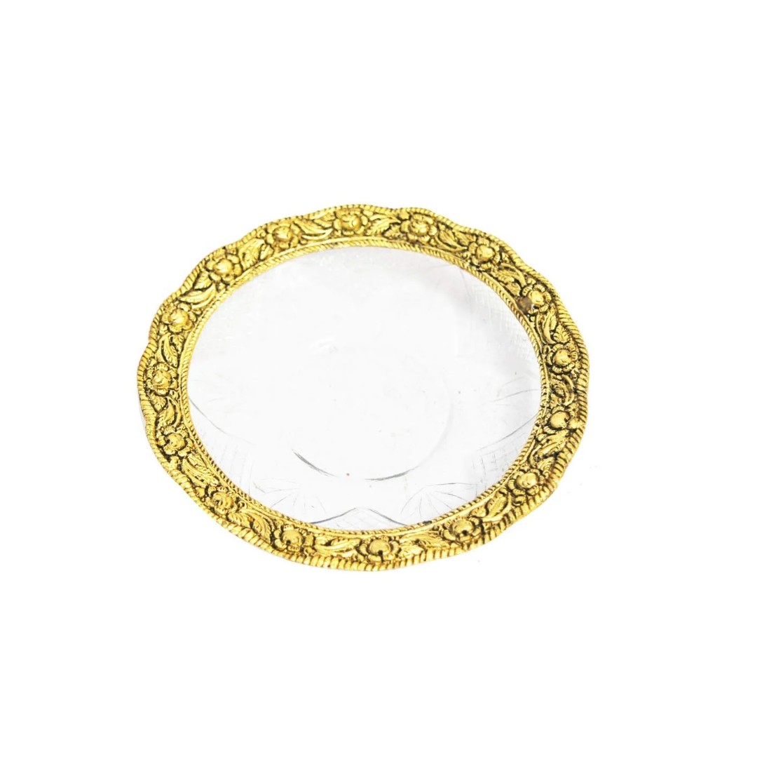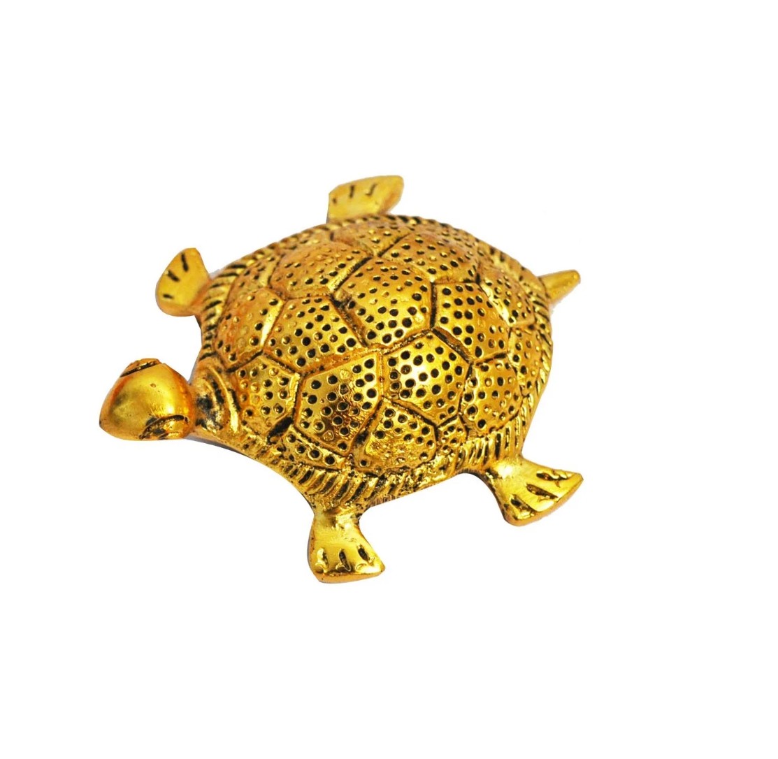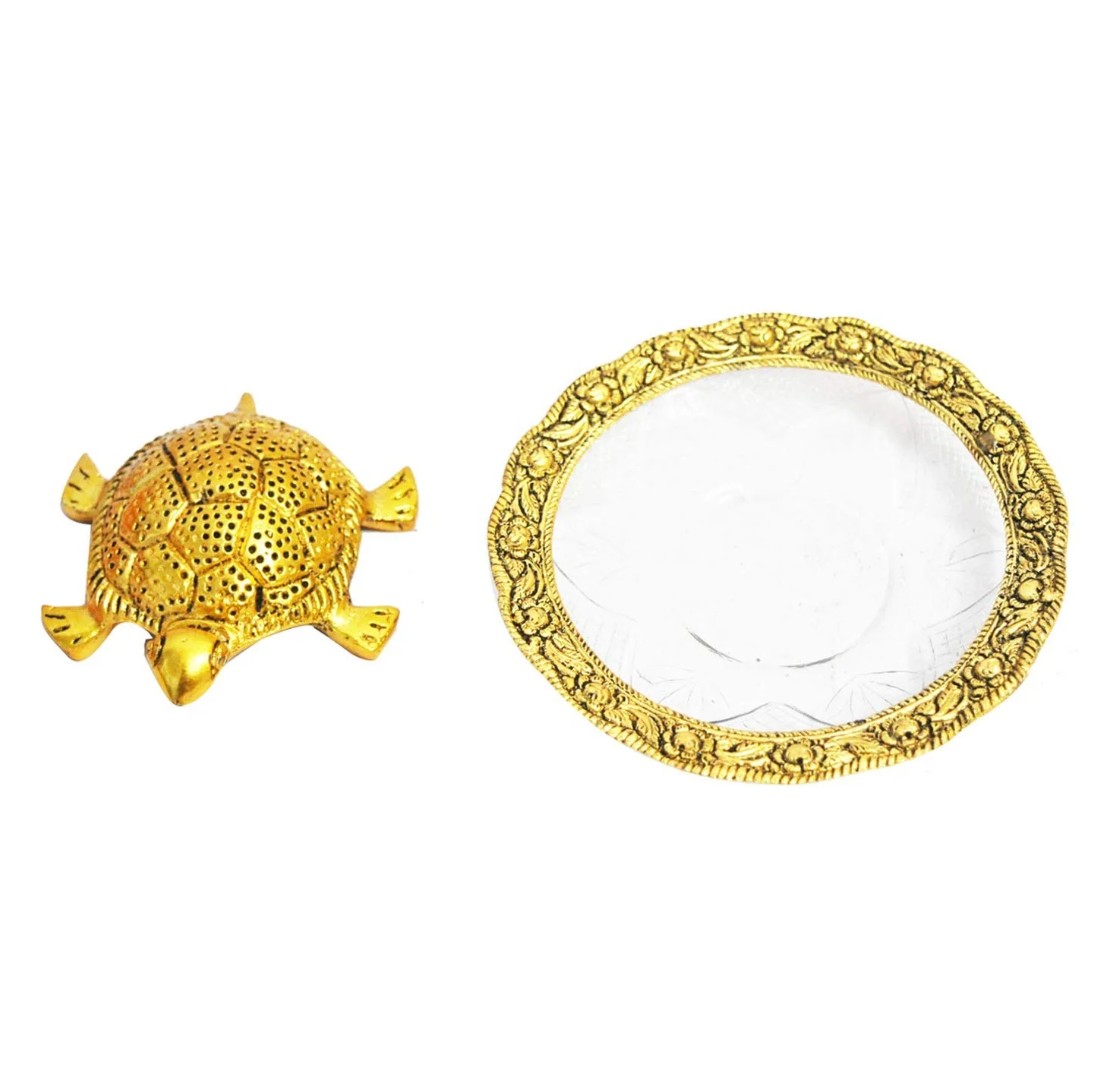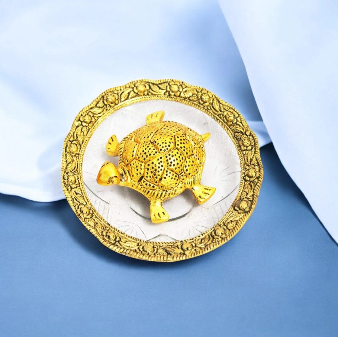 Golden Metal Tortoise on Glass Plate – Feng Shui Prosperity Decor