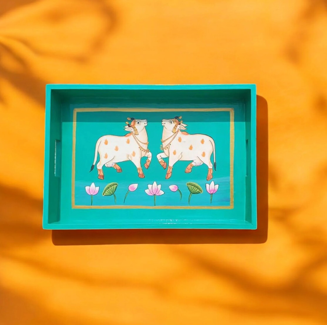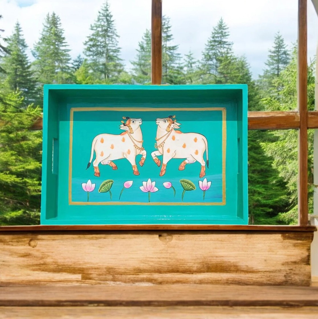 The tray features a classic Pichwai cow motif, symbolizing purity, devotion, and abundance. Two elegantly painted cows are showcased against a soothing green background, beautifully complemented by intricate detailing and vibrant colors. Available in 8×8 inches and 9×12 inches, this tray is perfect for serving tea, snacks, or meals, and also works wonderfully as a decorative accent in your home.