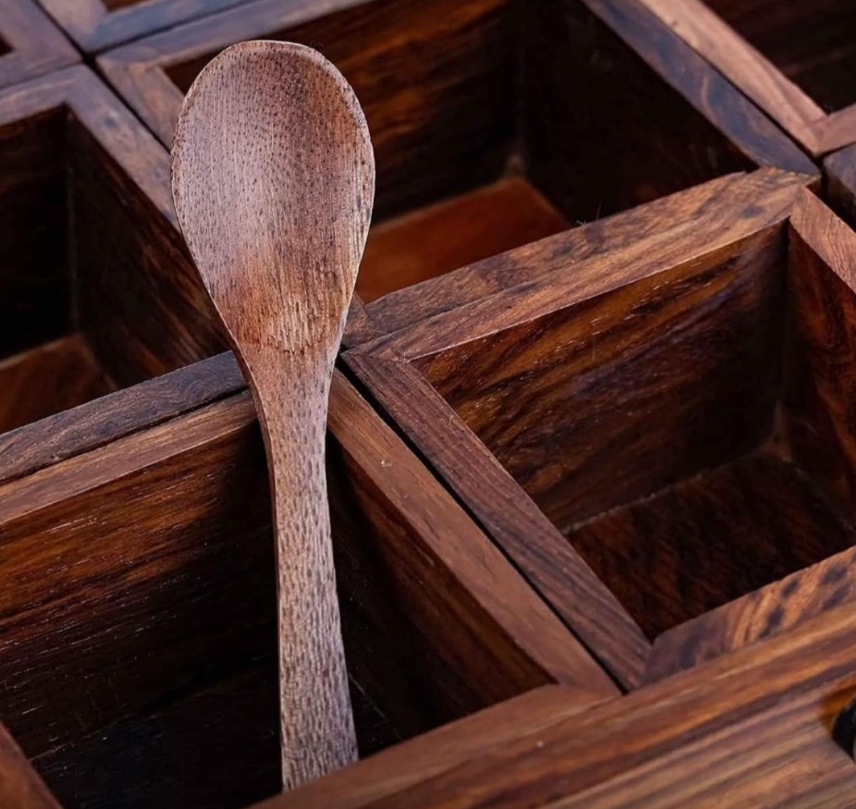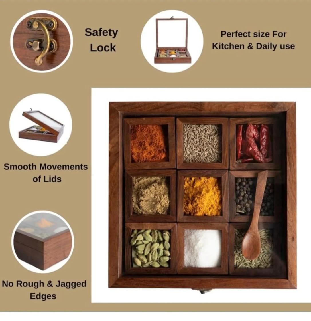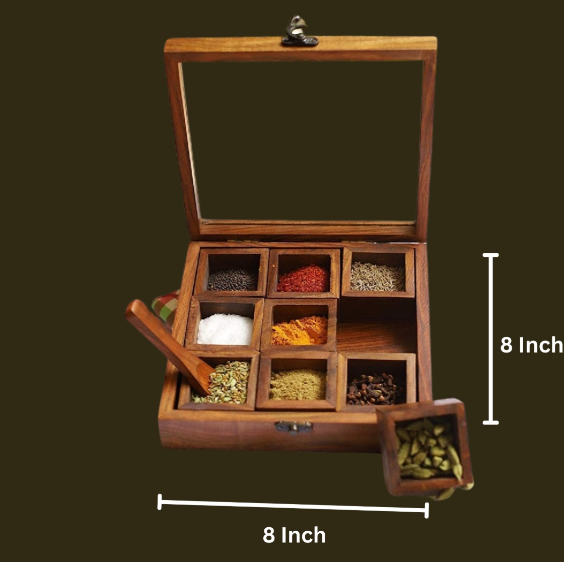 Store your spices in style with this beautiful wooden spice box, designed for both convenience and elegance. Crafted from high-quality wood such as sheesham or rosewood, this spice box adds a warm, rustic touch to your kitchen.