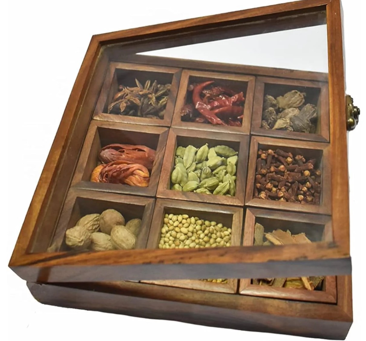 Wooden Spice Box with Glass Lid & Multiple Compartments